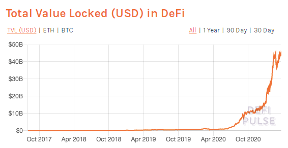 Il 2020 è stato l’anno del boom delle applicazioni di finanza decentralizzata. In pochi mesi il capitale affluito nel sistema è passato da poco meno di 1 miliardo di dollari a quasi 50.