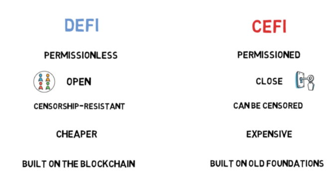 Qui una sintesi dei vantaggi della DeFi vs CeFi (o finanza centralizzata).