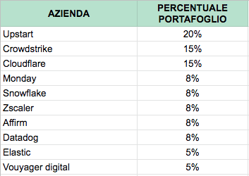 Quello che però farò dal 1° ottobre è registrare le performance che farei con un portafoglio limitato a 10 top company. Questo esperimento, che chiamerò “Golden ten”, mi servirà per capire se può valer la pena limitare gli investimenti a una ristretta rosa di aziende. Le prime 10 che ho selezionato con relativo peso sul portafoglio sono: